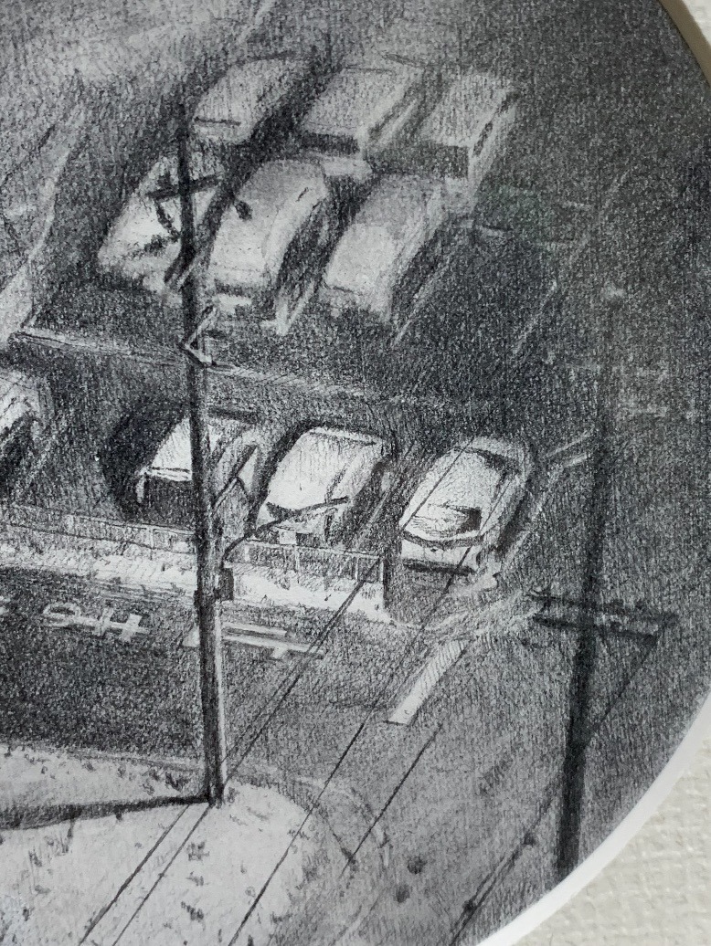 見る距離によって、遠目からは全体の構図の静けさと、近付けば鉛筆の粒子が作る細やかな表情、その両方を楽しめる作品です。