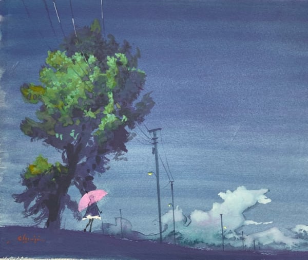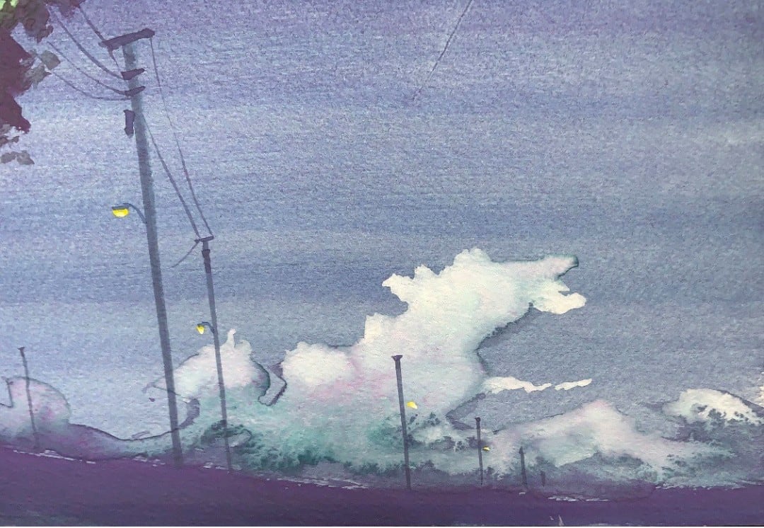 画面左上から右下へ向かう動きのある対角線構図や流し込みの技法を使った雲の表現などどこか心ざわめく湿度のある雰囲気を目指しました。