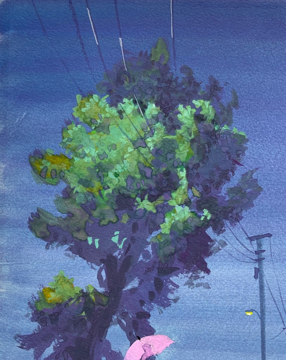 大きな木陰から点々と灯る街灯の灯りへと向かう女性。