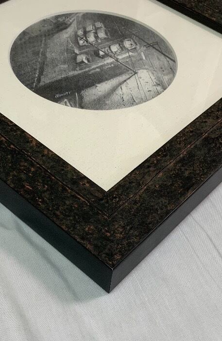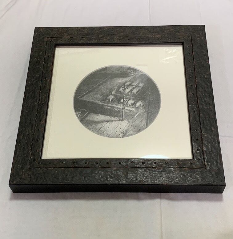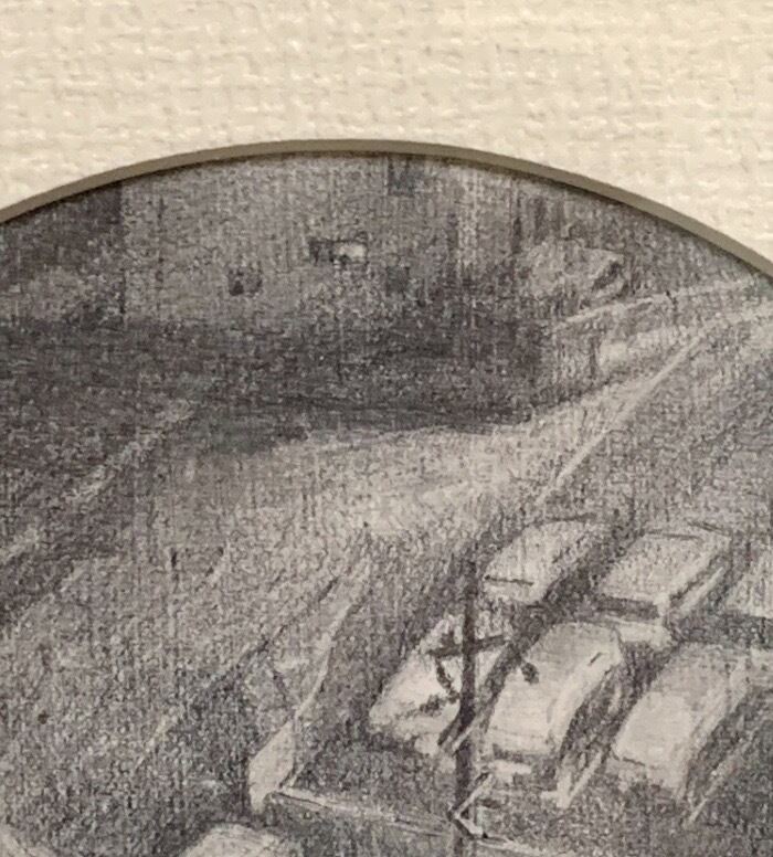夜景 /雪景色 /モノクロアート /円形アート /オリジナル /鉛筆画 /丸い絵 /黒い額 /シネマティック /街角の風景 /俯瞰構図 /モダンインテリア /写実画