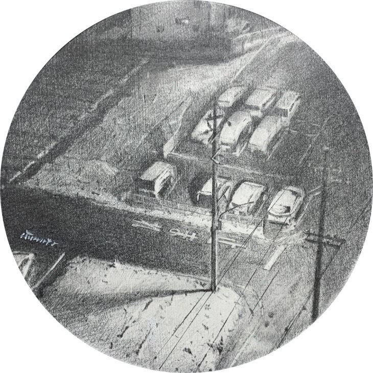 『冬の夜』は鉛筆を用いて日本の冬の夜景を写実的に表現した円形の作品です。静寂に包まれた冬の深夜、ありふれた郊外の俯瞰構図、雪の残る独特の温かみも感じさせるシネマティックな一枚。寒い季節でも心温まる空間を作り出し、リビングや寝室にぴったりな美術作品です。